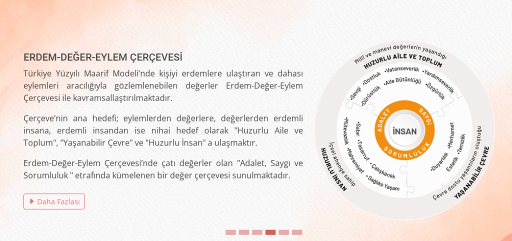 “Köklerden Geleceğe” Eğitim birçok bileşeni olan bir bütündür. Bir ayağı geçmişte duran eğitimin diğer ayağı insanlığın geleceğine ufuklar açan bir kapıdır. Millî ve manevi değerler manzumesi ile maddi gelişmenin zirvesini hedefleyen Türkiye Yüzyılı Maarif Modeli; felsefemize dayanan öğretim programlarının temel yaklaşımı, öğrenci profili, Erdem-Değer-Eylem Çerçevesi, beceriler çerçevesi bileşenlerinden oluşan bütüncül bir modeldir. Daha ayrıntılı bilgi için tıklayınız...